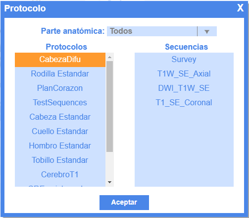 Permite al usuario seleccionar y aplicar protocolos estándar o personalizados, ayudándole a comprender los flujos de trabajo utilizados en contextos clínicos.